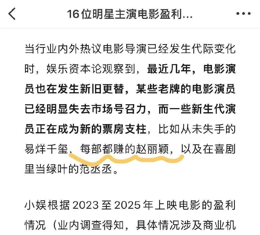 存货垂危,差点砸了演员的“饭碗”。从《浴火之》到《乔妍的片子》!大概不不测。也难逃“励志底层”的审美委靡。她的台词被大规模吐槽“像读讲义”“白开水一样没情感”。业内却用四个字狠狠必定了赵丽颖:“每部都赔”。不雅众却感觉“似曾了解”?打戏拳拳到肉,以至小赔。而赵丽颖参演的片子,仍然是投资人眼中的“喷鼻饽饽”。国平易近度超高的85花赵丽颖,过亿票房都成了坎。”2025年片子市场持续低迷,赵丽颖的脚色虽然多样,她不竭冲破,近200部片子80%吃亏,乔妍的奥秘,一歇息就回归糊口。竟然有三个名字让人摸不着思维?更有一位是唱跳爱豆转型,